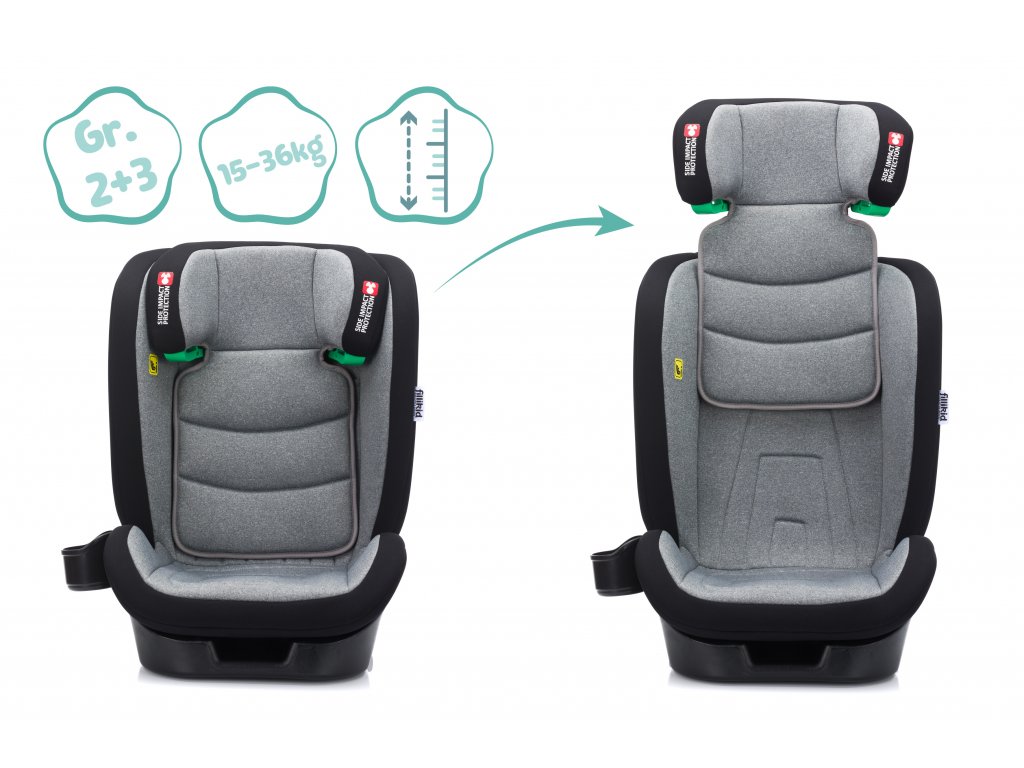 Autosedačka s novým standardem Isofix i-size, skupina 2+3. Pro děti 100 cm - 150 cm (15 - 36 kg), variabilní ISOFIX, zádová opěrka nastavitelná do 3 poloh a nastavitelná opěrka hlavy. Ochrana proti bočnímu nárazu. K dispozici držák nápojů.