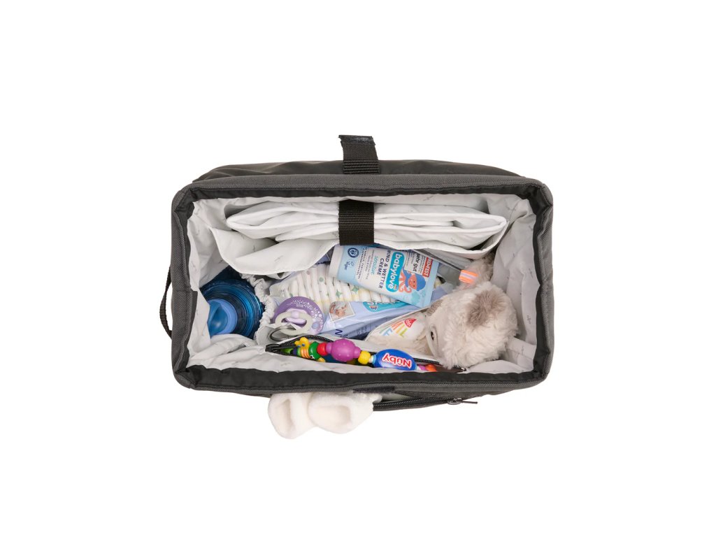 Díky praktickým vnitřním přihrádkám a velkorysému úložnému prostoru budete mít všechny nezbytnosti, jako jsou plenky, lahvičky nebo náhradní oblečení, vždy po ruce. Pro ještě větší pohodlí je součástí balení přebalovací podložka (bez PVC, omyvatelná), vyjímatelná taška na špinavé prádlo a termoizolační přihrádka na lahvičky či svačinku.